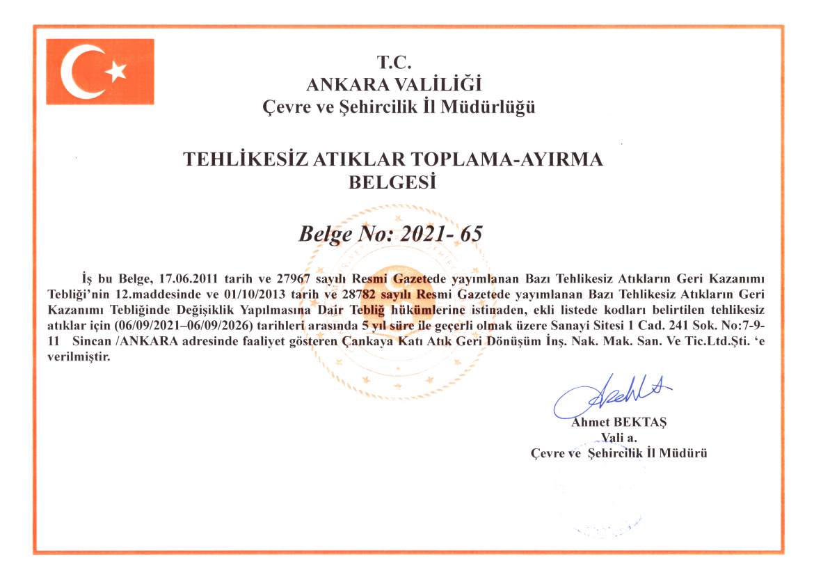 Tehlikesiz Atıklar Toplama-Ayırma Belgesi